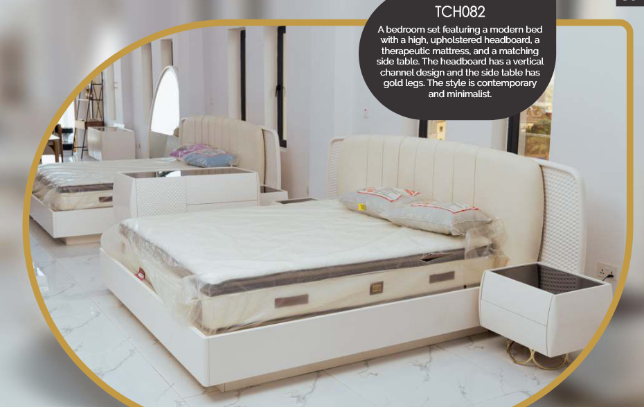 A bedroom set featuring a modern bed with a high, upholstered headboard, a therapeutic mattress, and a matching side table. The headboard has a vertical channel design and the side table has gold legs. The style is contemporary and minimalist.